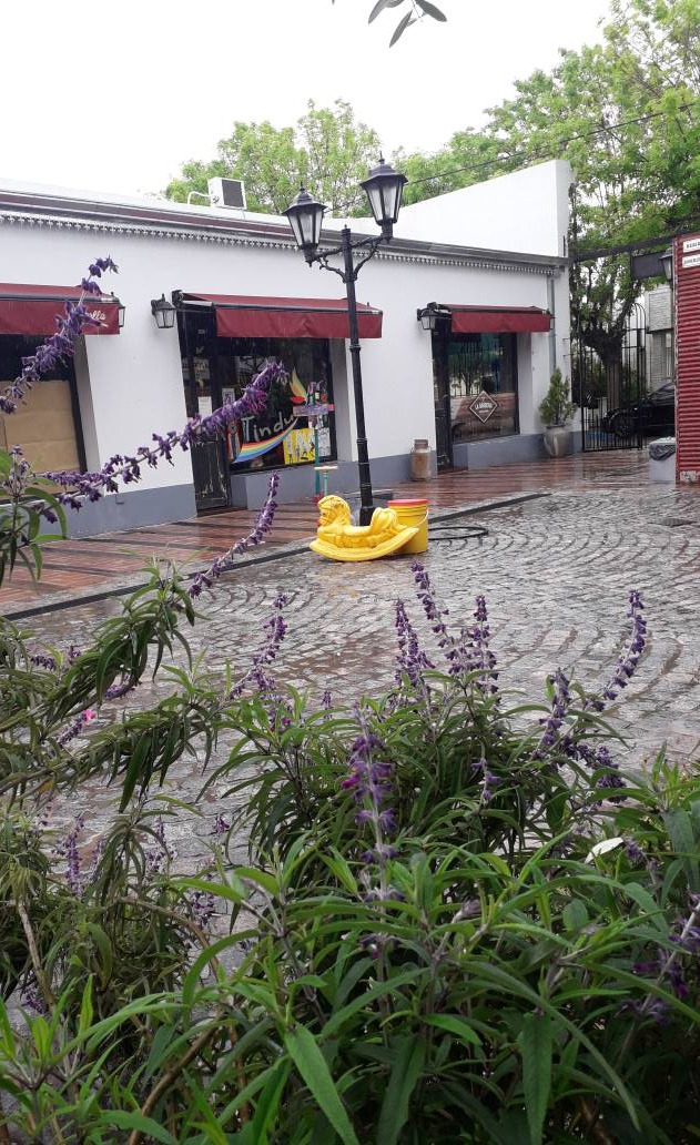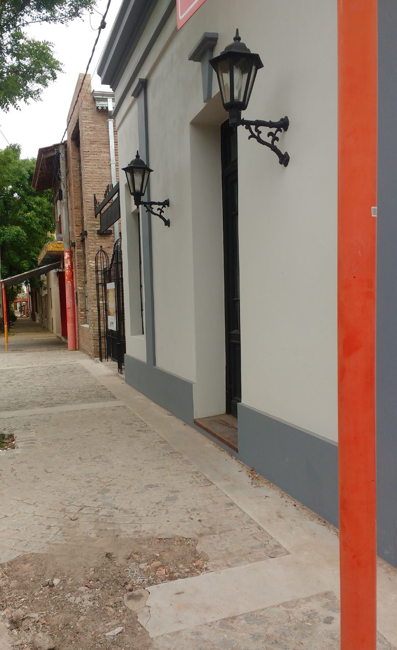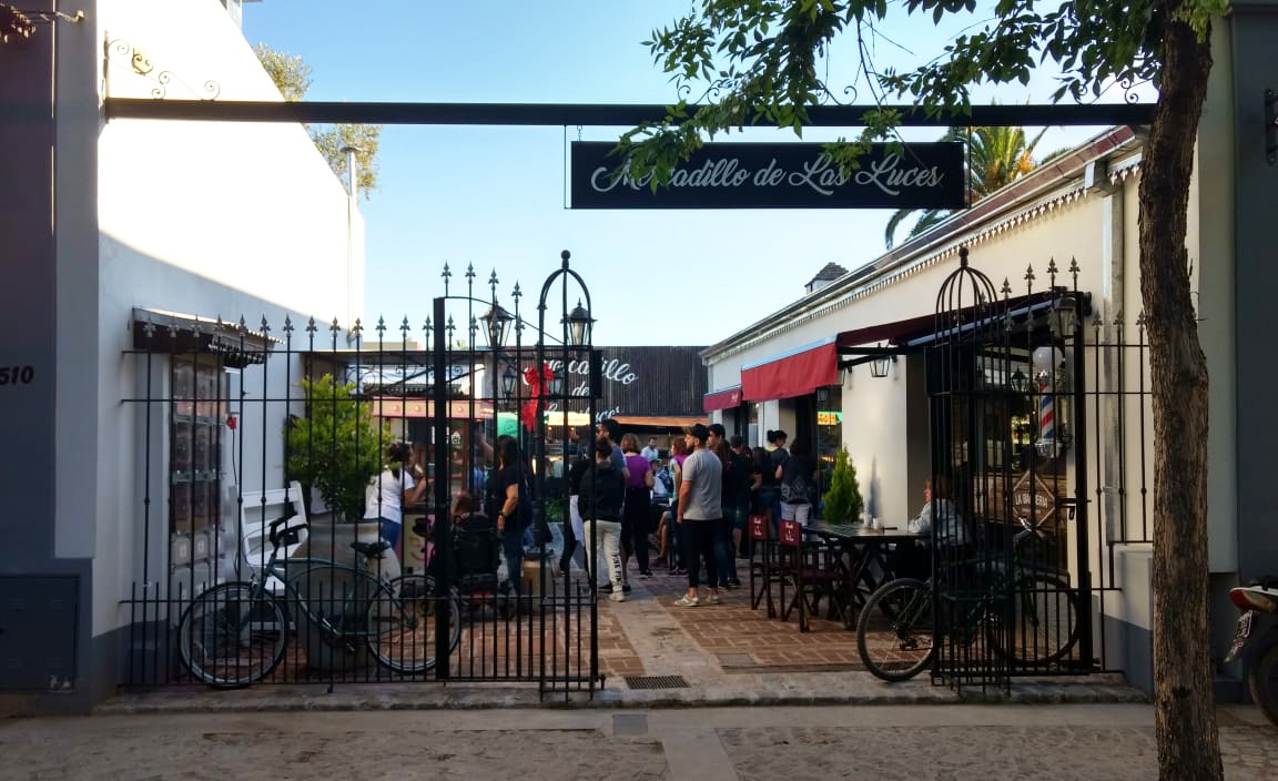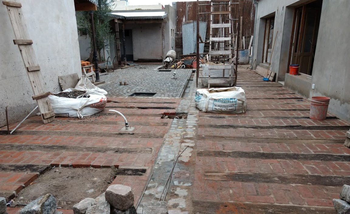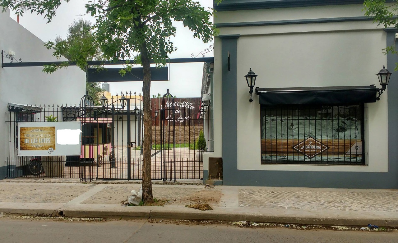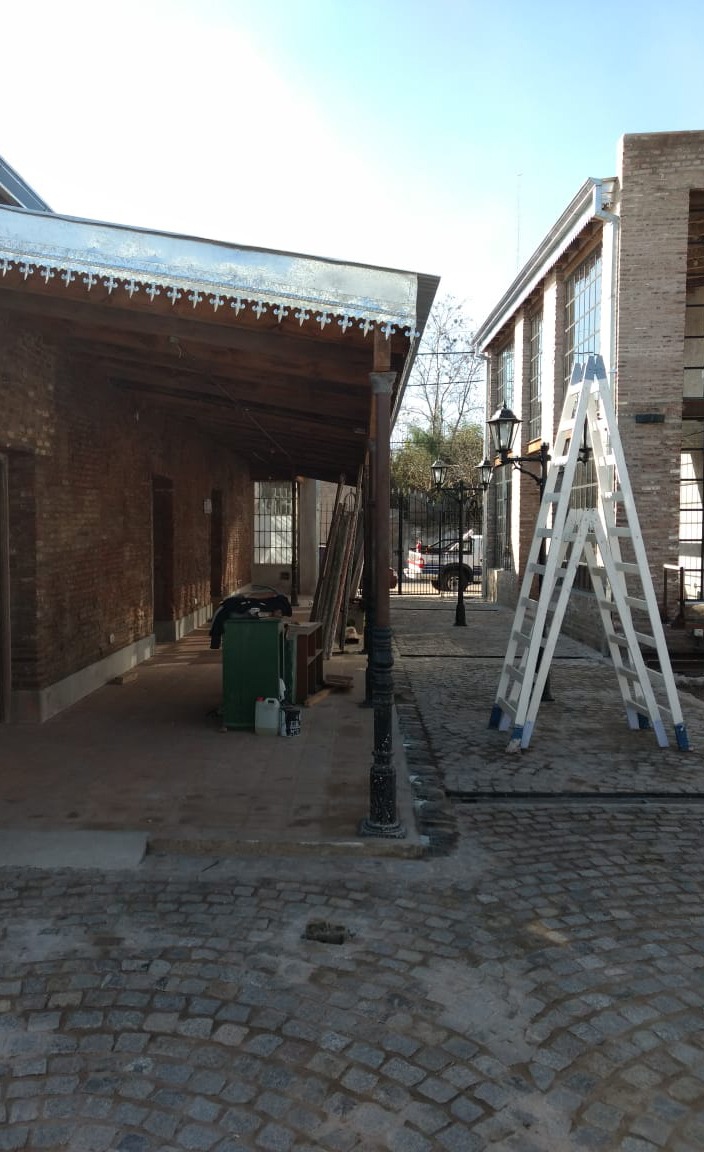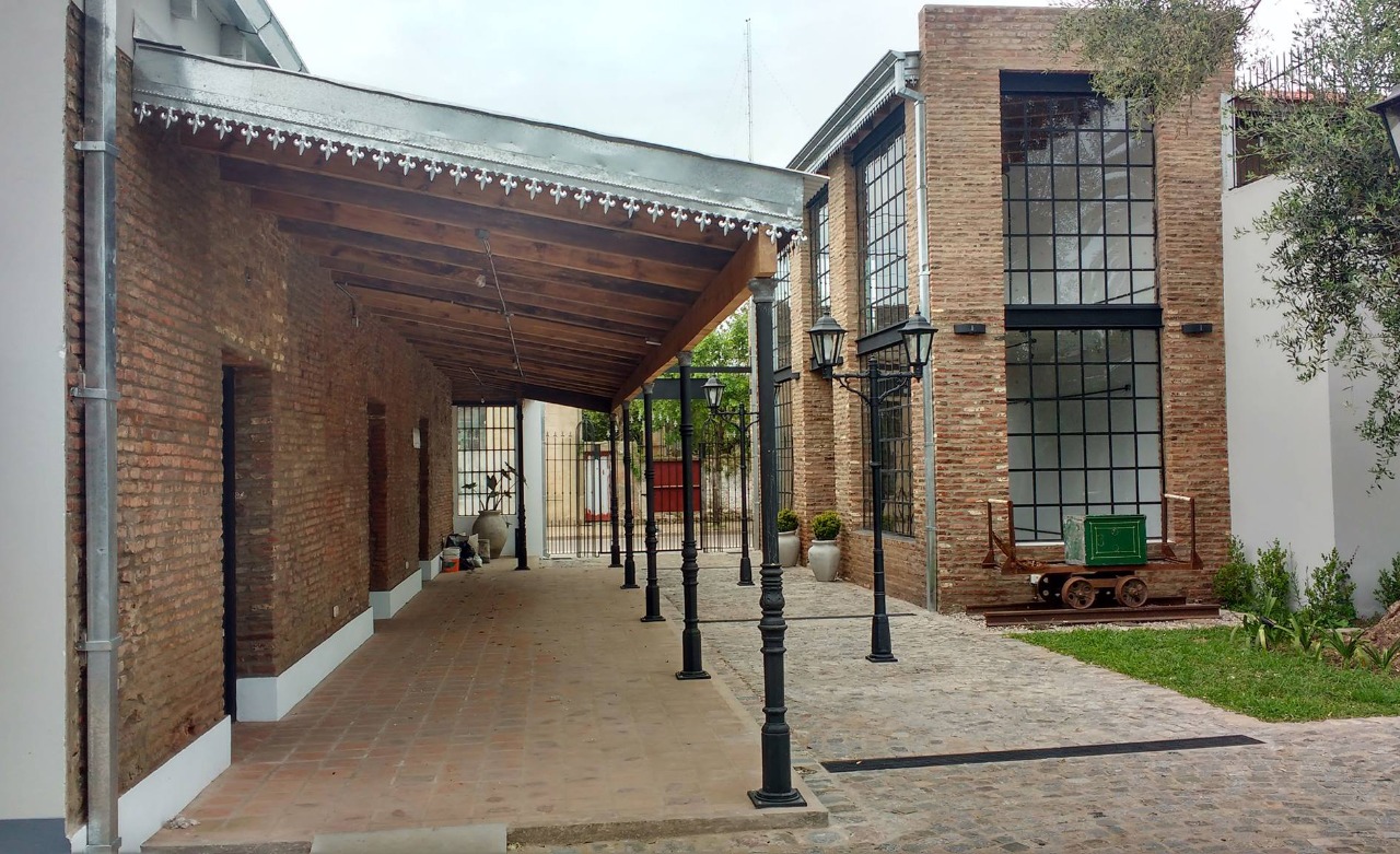 Por último, el camino peatonal interno fue materializado con adoquines, ladrillos de demolición, durmientes de ferrocarril, chapas usadas, faroles de diseño colonial, rejas de hierro forjado en los accesos, bancos de madera y toldos de lona, con el imponente árbol de olivo como bisagra del recorrido.