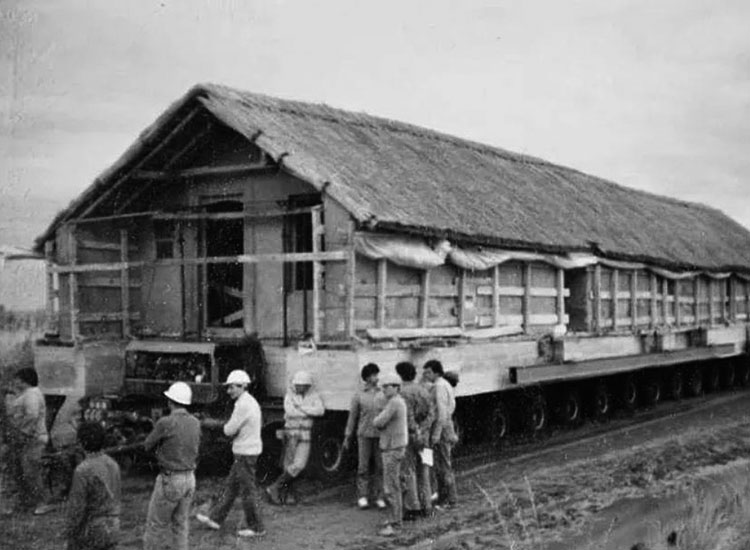 Posteriormente se realizó una excavación y fue alzado un metro y medio y colocado en un carretón especialmente construido para desplazarlo, llegando a pesar unas 140 toneladas.